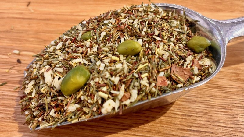 Rooibos vert, coco râpée, copeaux de chocolat blanc (sucre, beurre de cacao, lait en poudre, dextrose, émulsifiant: lécithine de soja) (10%), pistaches, écorce de cacao, arôme