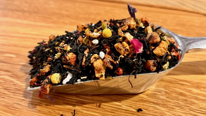 Thé noir (51%), morceaux de pomme, arôme, camomille, morceaux de fraises lyophilisées, poivre rose (2%), granules de citron lyophilisé (maltodextrine, fruit (jus de citron), huile naturelle de citron, agent gélifiant: alginate de sodium), pétales de rose, fleurs de mauve.